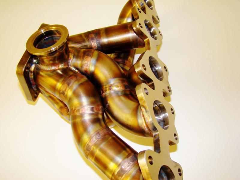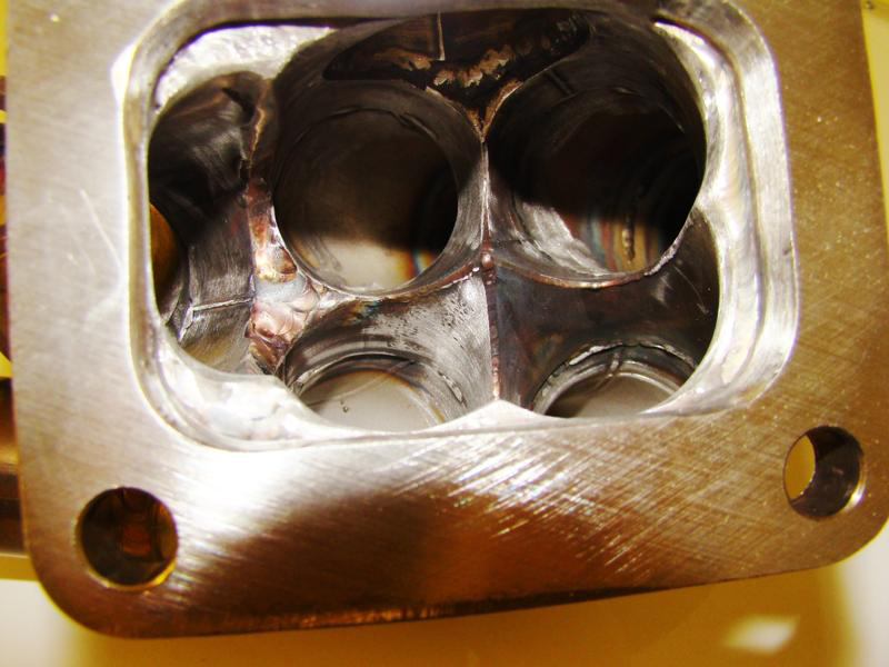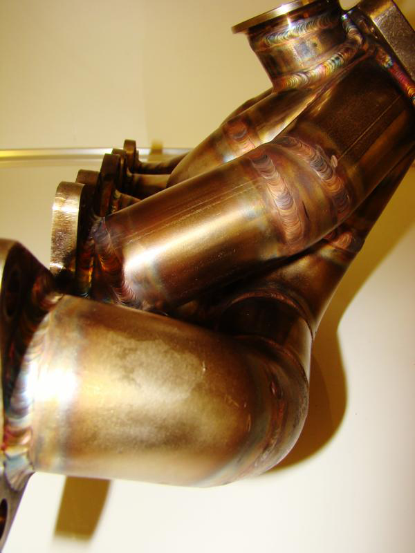 This new manifold is identical to the one we use on our 950 WHP 1993 S4 Bonneville race car. It allows the mounting of large frame (GT42) size turbos with proper hood clearance and has an orientation which allows easy down-pipe fabrication. We have a 4 inch down-pipe on the race car and it clears the strut tower with ease.